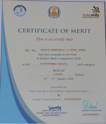 Our Student PRANAV ADHITHYA C.S was awarded the Runner Up from District Skill Competition 2020 in the Skill Category IT NETWORK CABLING organized by TAMILNADU SKILL DEVELOPMENT CORPORATION (TNSDC) and District Administration, Namakkal. He was recognized by Namakkal District Collector Thiru K.Megraj , I.A.S.