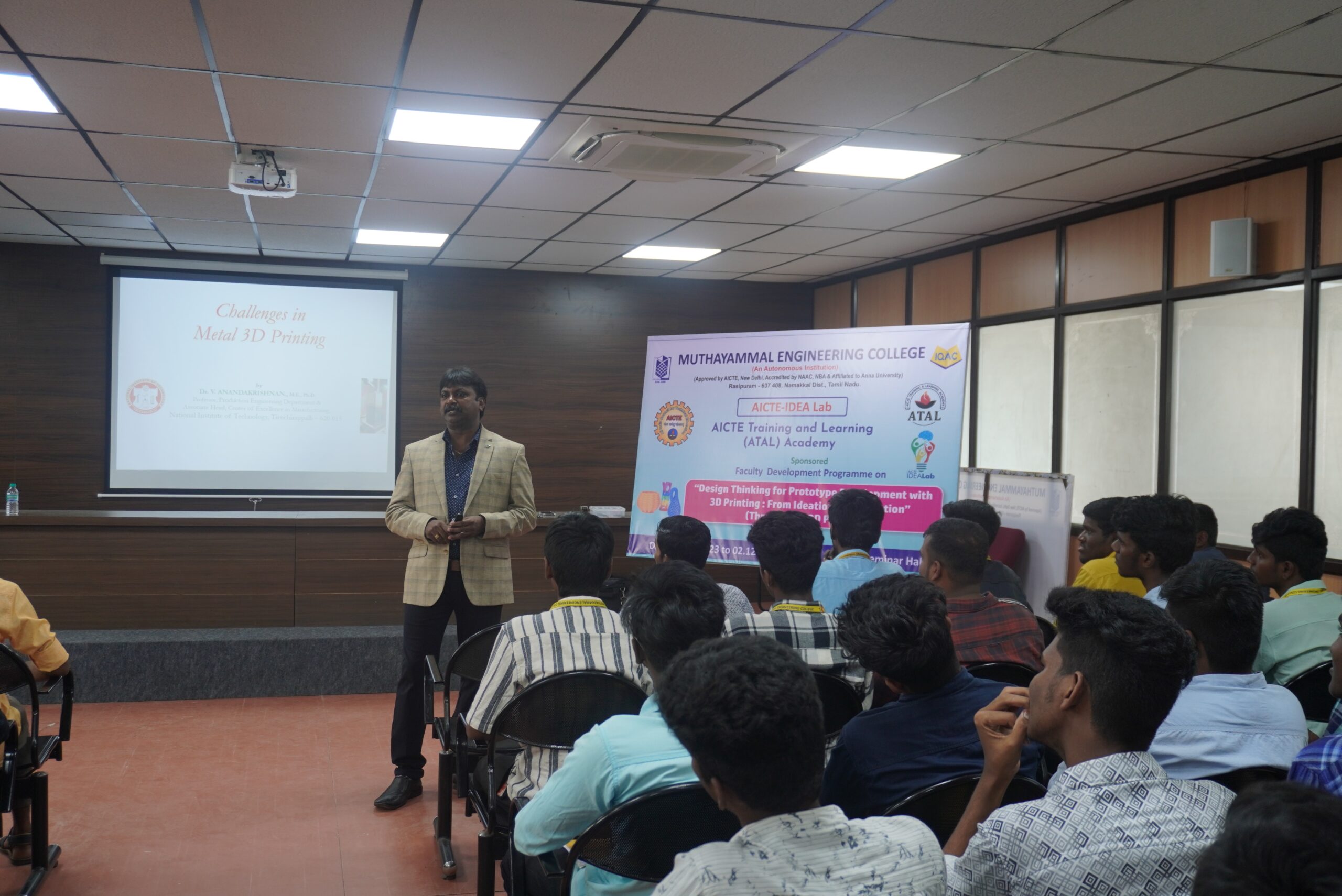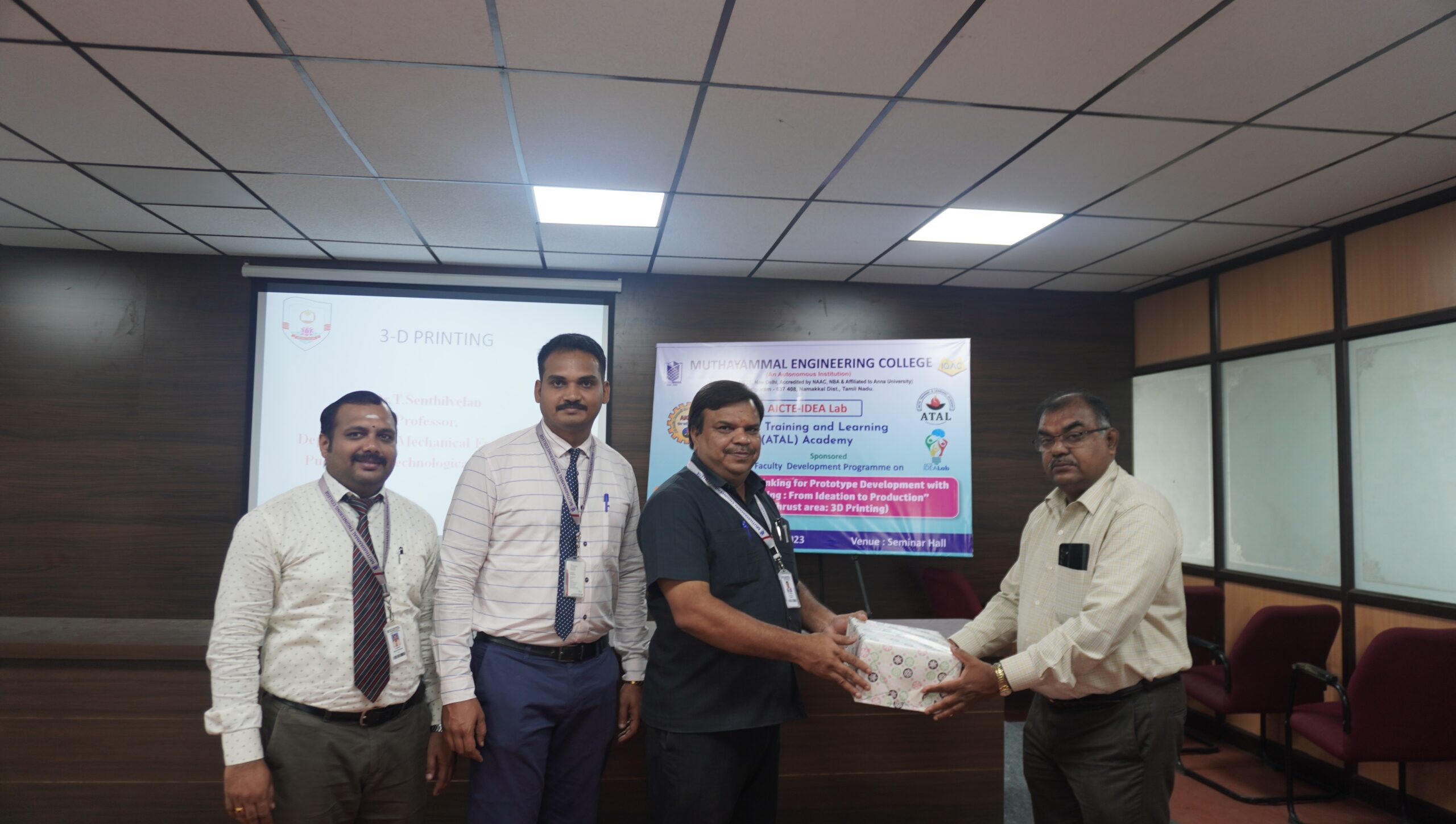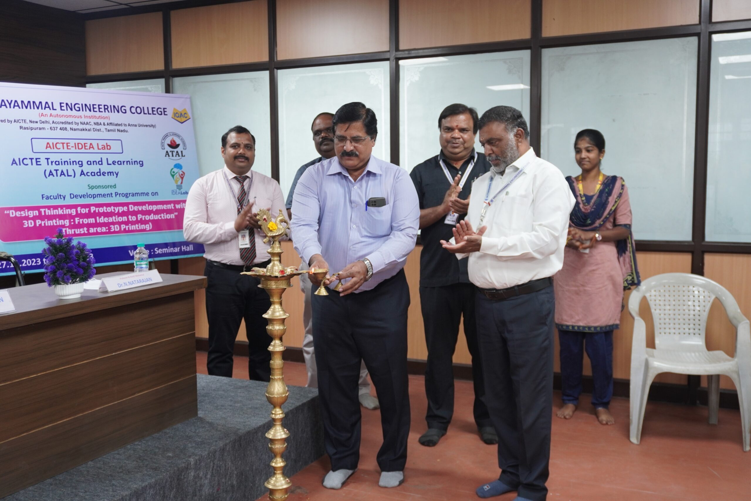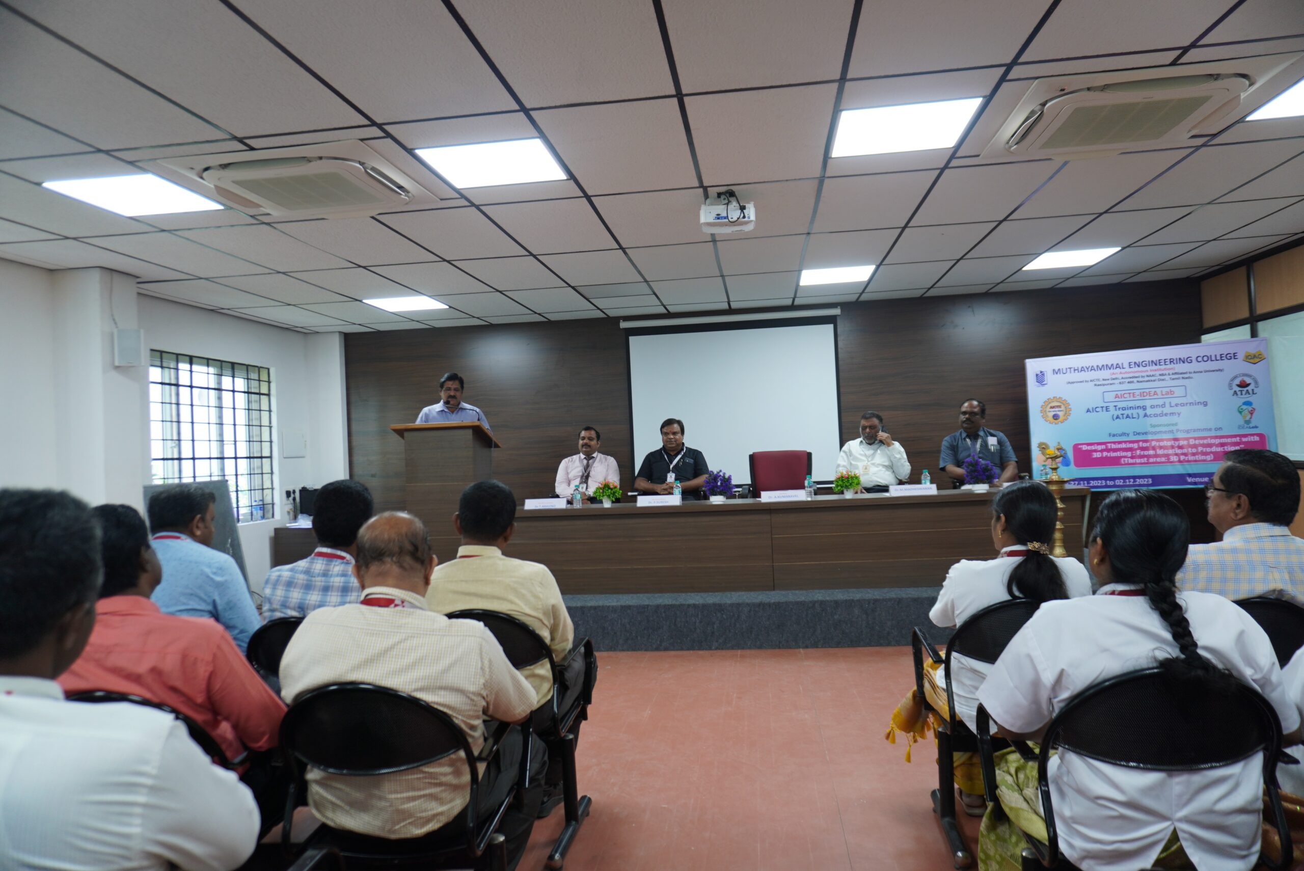 The AICTE Training and Learning (ATAL) Academy Sponsored Six-day Faculty Development Programme on “Design Thinking for Prototype Development with 3D Printing: From Ideation to Production” is an exquisite event organized by the AICTE IDEALAB (AICTE/IDC/IDEA202000186/21) at the Muthayammal Engineering College. This remarkable program, commenced on date of 27.11.2023, aspires to elevate the knowledge and expertise of the faculty members who have graciously chosen to participate.