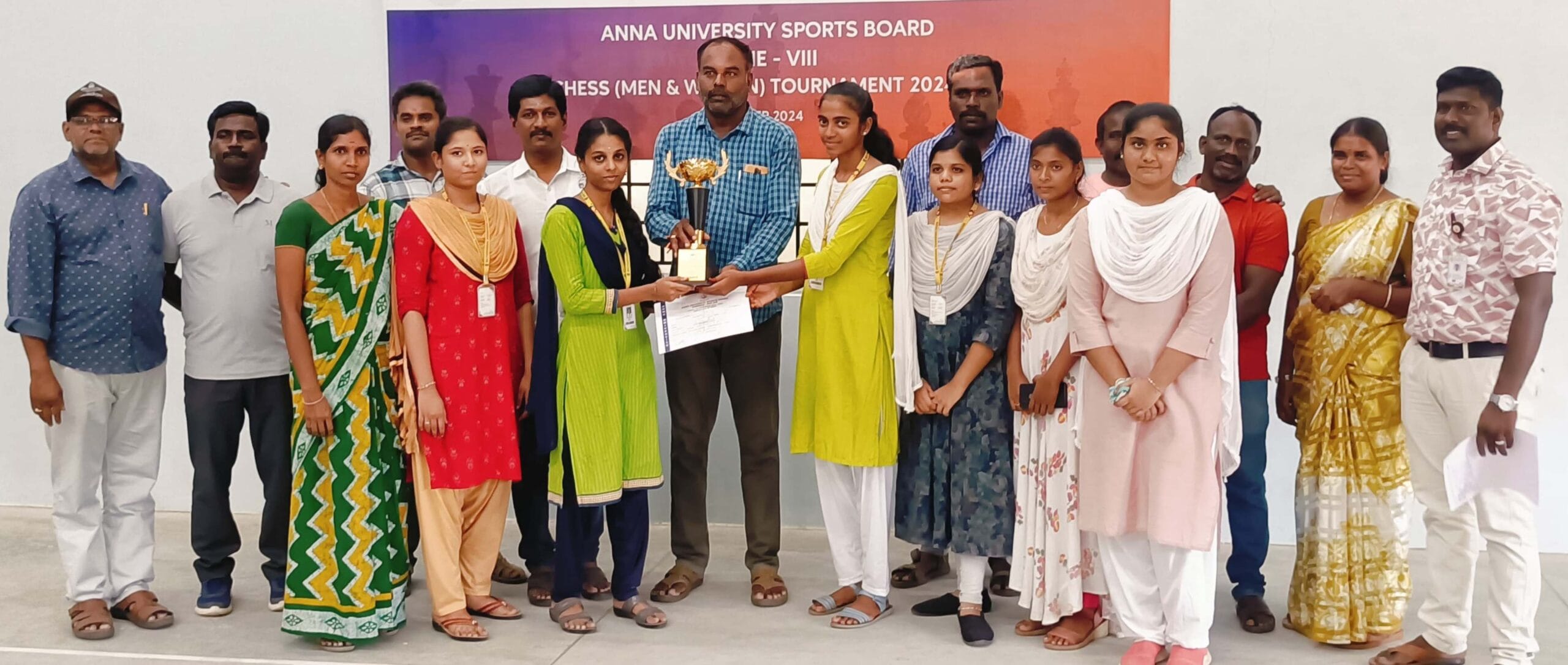 S. Sahastra, S.M.R. Rakghitha, K. Santhiya, M. Prabhanjani, R. Kanishca, and B.S. Shabanam from Muthayammal Engineering College secured the First Prize in the Anna University Zonal Chess (Women) Tournament, which took place at Paavai Engineering College. The trophy and certificates were presented to the winners by Dr. N. Santhanaraja, the Sports Zonal Secretary.