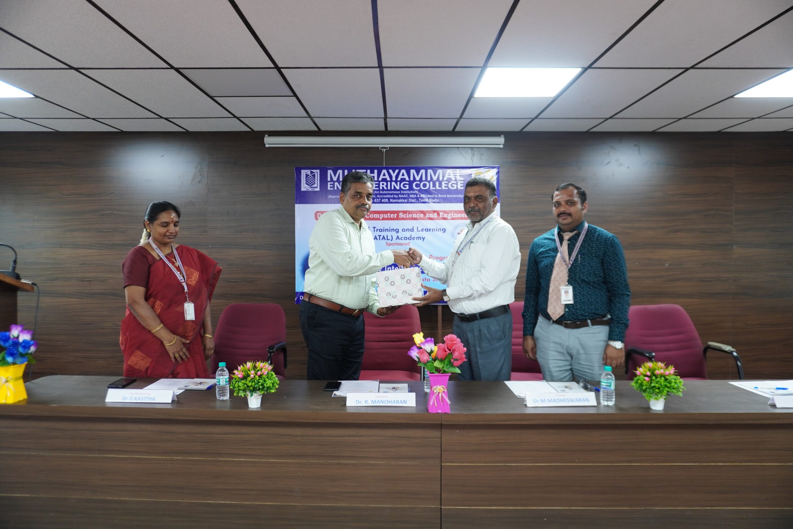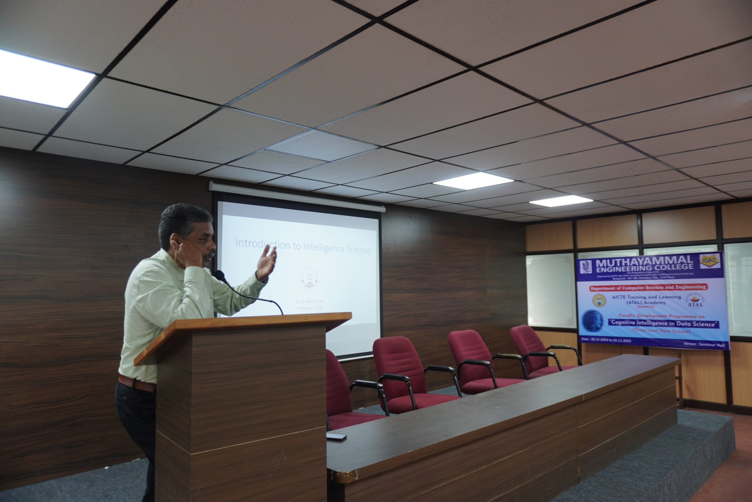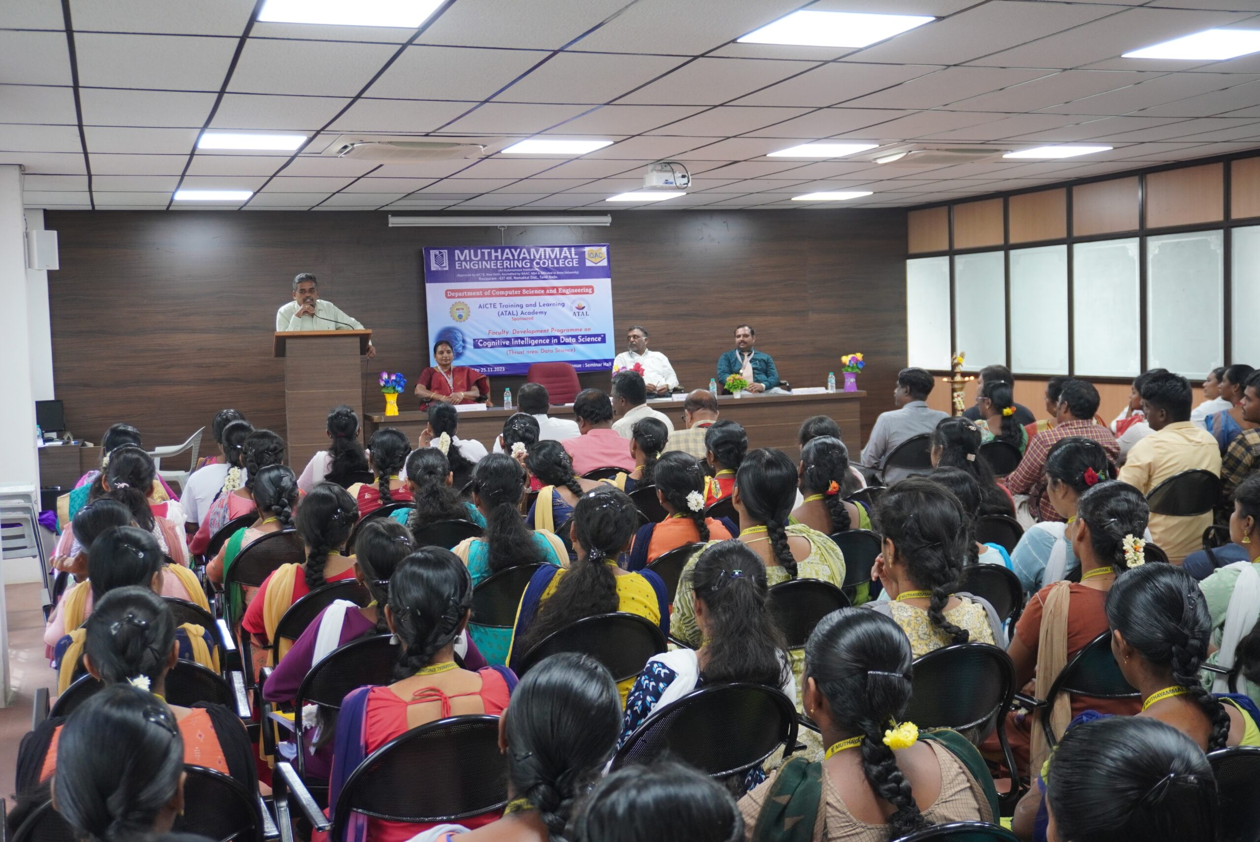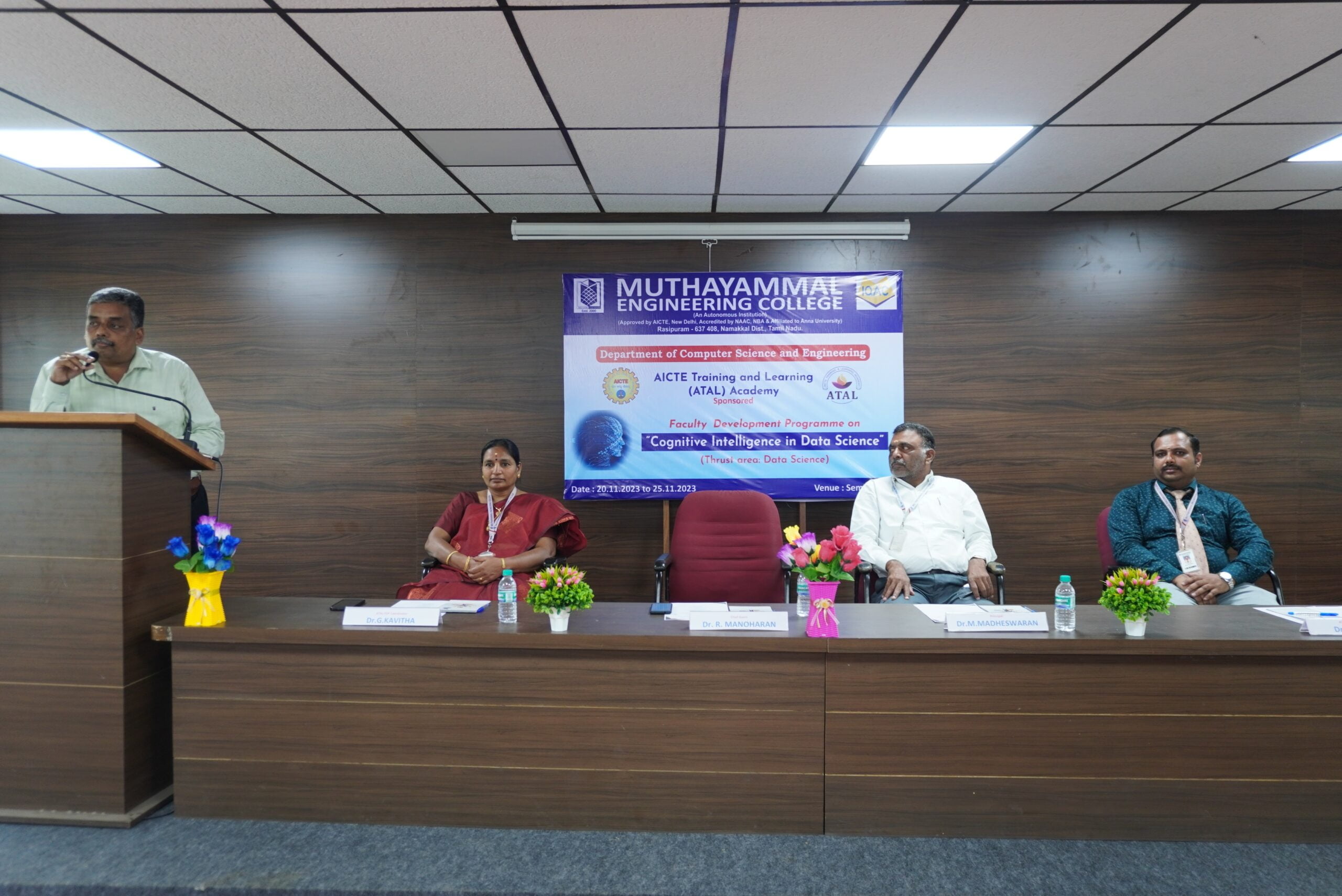 The Inauguration of AICTE Training and Learning (ATAL) Academy Sponsored Six days Faculty Development Programme on “Cognitive Intelligence in Data Science” is being organized by the Department of Computer Science and Engineering held at Muthayammal Engineering College on 20.11.2023. Dr.R.Manoharan, Professor from the Department of Computer Science and Engineering, Puducherry Technological University had the honor of being the Chief Guest for the Inaugural Function and also conducted a session as Resource Person. A total of 46 Faculty members from different Engineering Colleges registered and actively participated in the FDP.