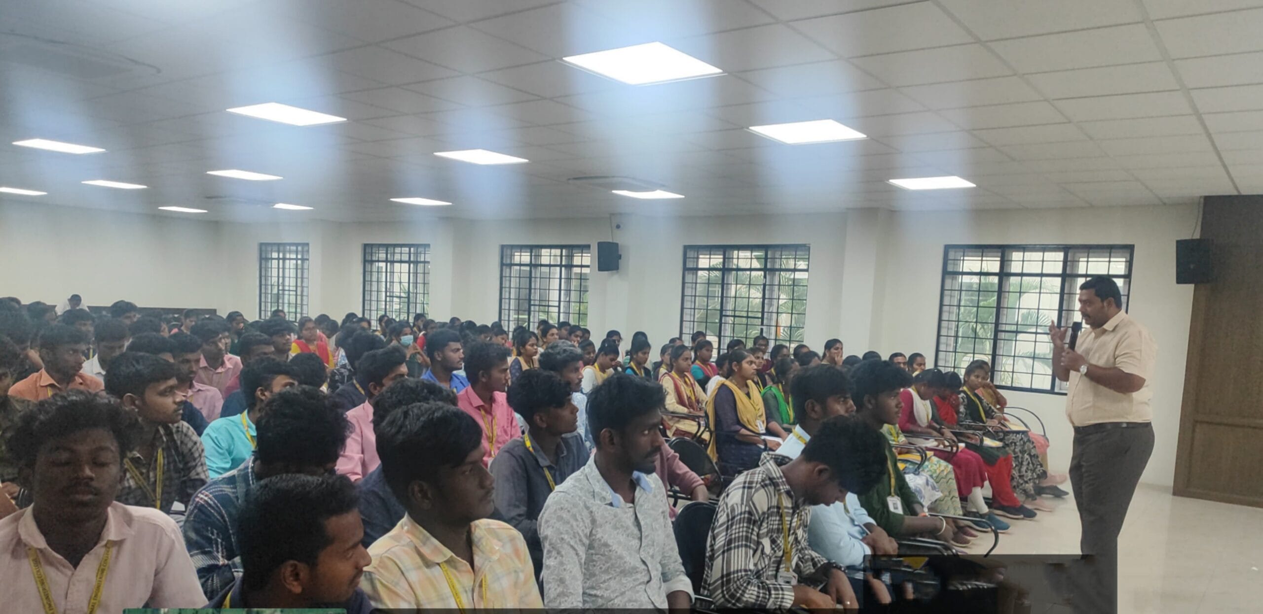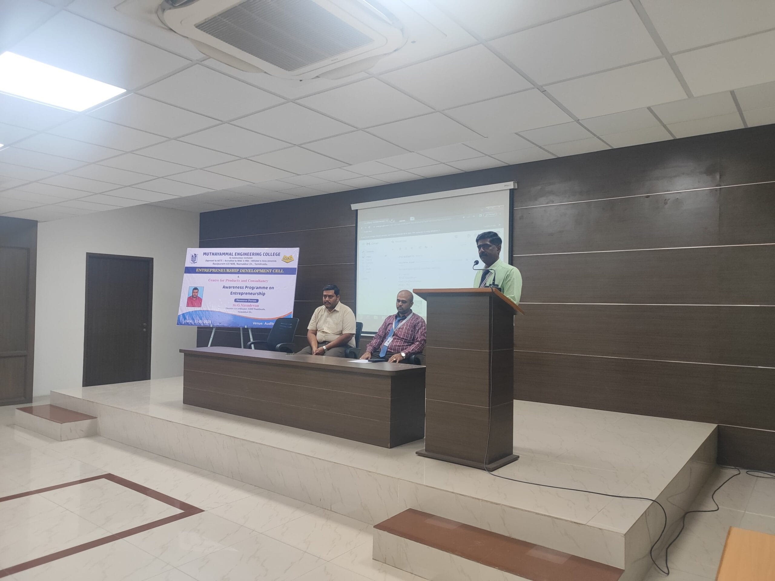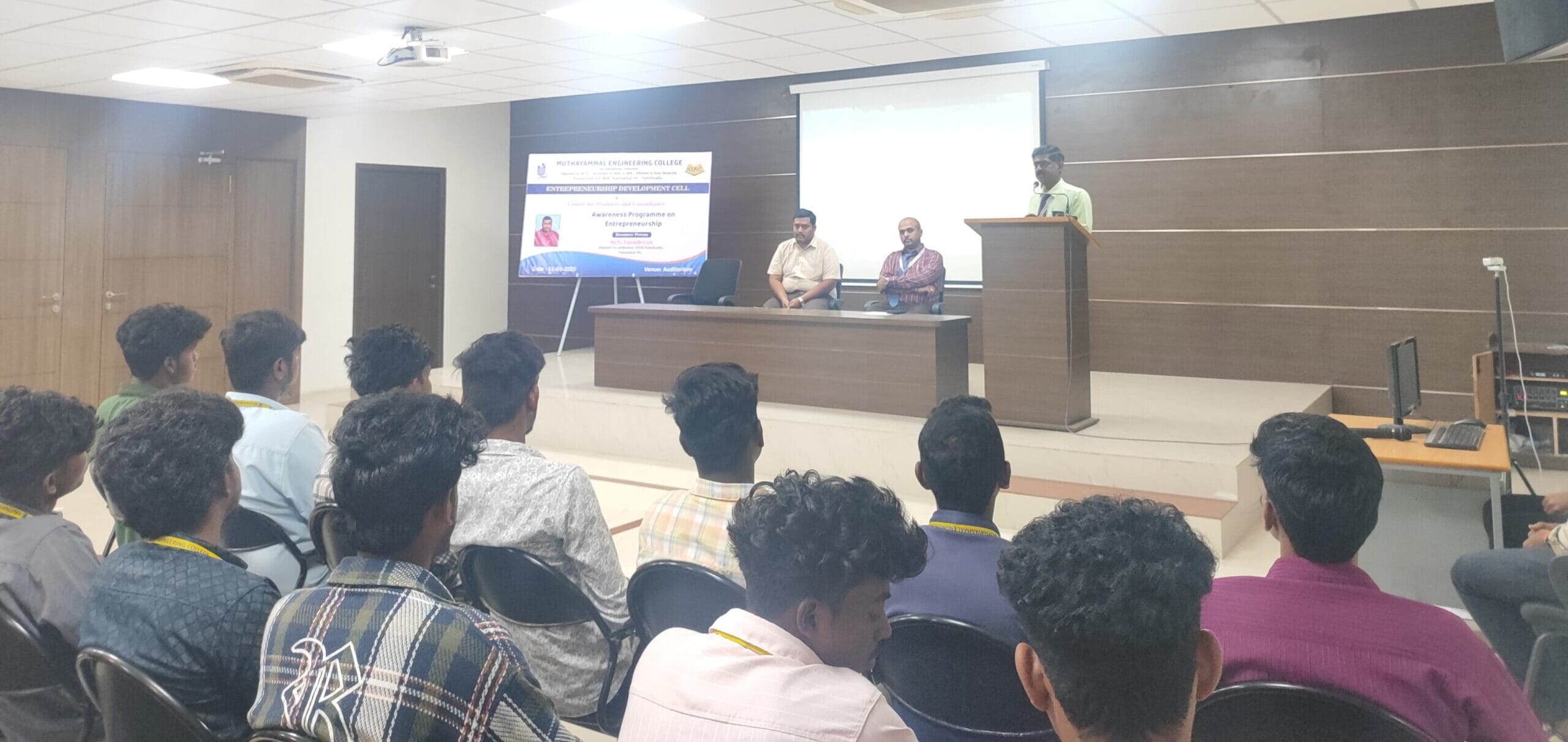 The Entrepreneurship Development Cell (EDC) of Muthayammal Engineering College conducted an Awareness Programme on Entrepreneurship. The Chief Guest, Mr. G. Vasudevan, District Coordinator, EDII, Namakkal District, shared valuable insights on the local entrepreneurship landscape, discussing opportunities and challenges in the region. He elaborated on various government initiatives supporting entrepreneurs, including funding schemes, training programs and incubation facilities. Encouraging students to explore their entrepreneurial potential, he emphasized leveraging available resources for success. He also spoke about future collaborations between the district’s government offices and the EDC to create better opportunities for young entrepreneurs.