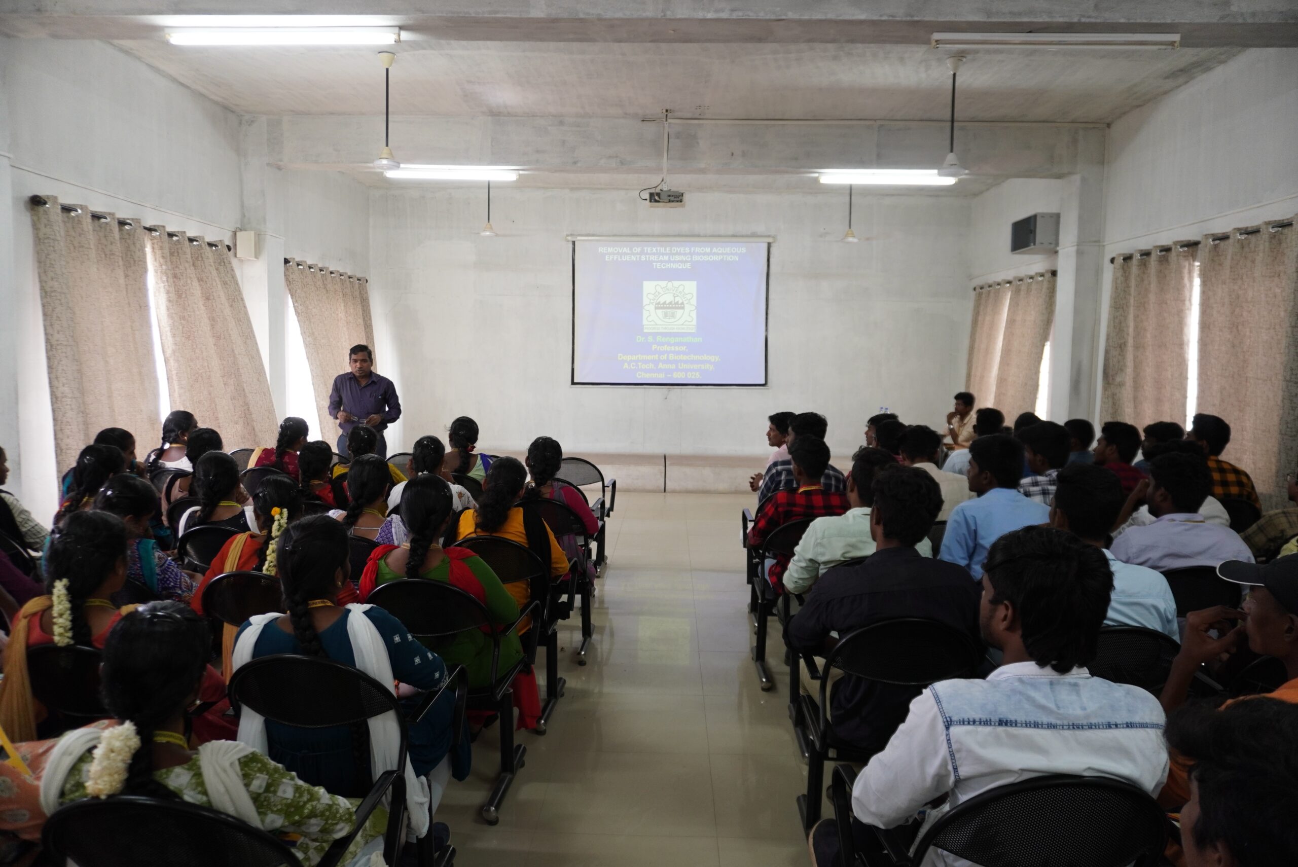 On 02-11-2023, the Department of Biotechnology organized a workshop titled “Biosorption studies on waste water by microalgae and its commercial applications,” which was successfully conducted. We were privileged to have Dr. S.Renganathan, a distinguished Professor from the Department of Biotechnology at A.C.Tech, Anna University, Chennai, as our chief guest, who delivered an expert talk on the subject. Dr. S.Renganathan shared valuable insights into the biosorption techniques used for treating various industrial waste waters, including textile dyes, and discussed the calculations of adsorption isotherms. The students had the opportunity to interact with Dr. S.Renganathan and were greatly inspired by his expertise. This session proved to be highly beneficial for the students as they could incorporate the knowledge gained into their end semester projects. The workshop was efficiently coordinated by Mr. B.Prasanna, an Assistant Professor in the Department of Biotechnology.
