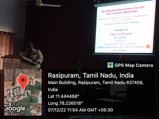 Seminar on IDEA TO PATENT Was Conducted by the Department of Master of Computer Applications in association with Center for Product and Consultancy on 07/12/2022. The Resource Person of the event was Dr.B.Gopi, Dean/PAC, Muthayammal Engineering College. He delivered about what is mean by PATENT, Intellectual Property, Trade Mark, Copyrights, Trade Secret, Patent Filing and the students are actively participated in the Seminar.