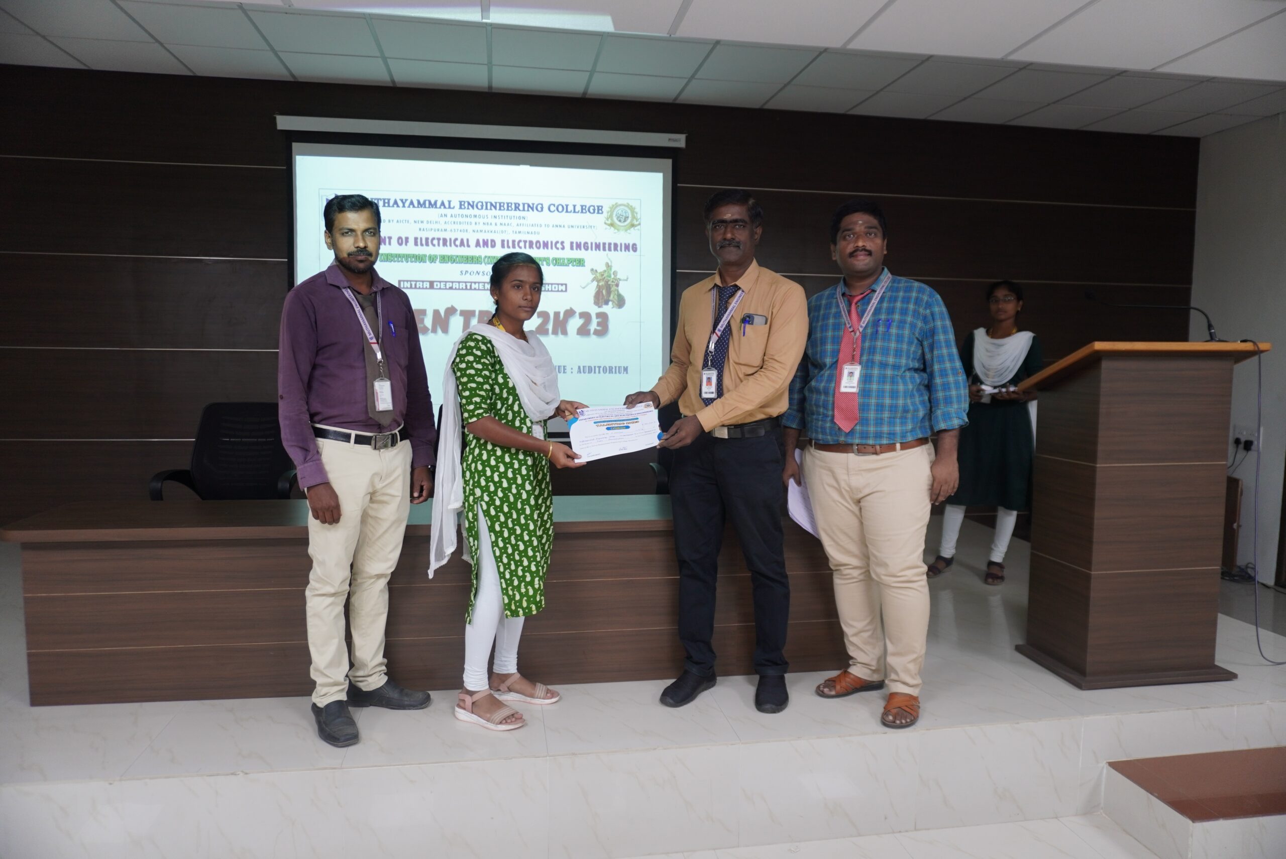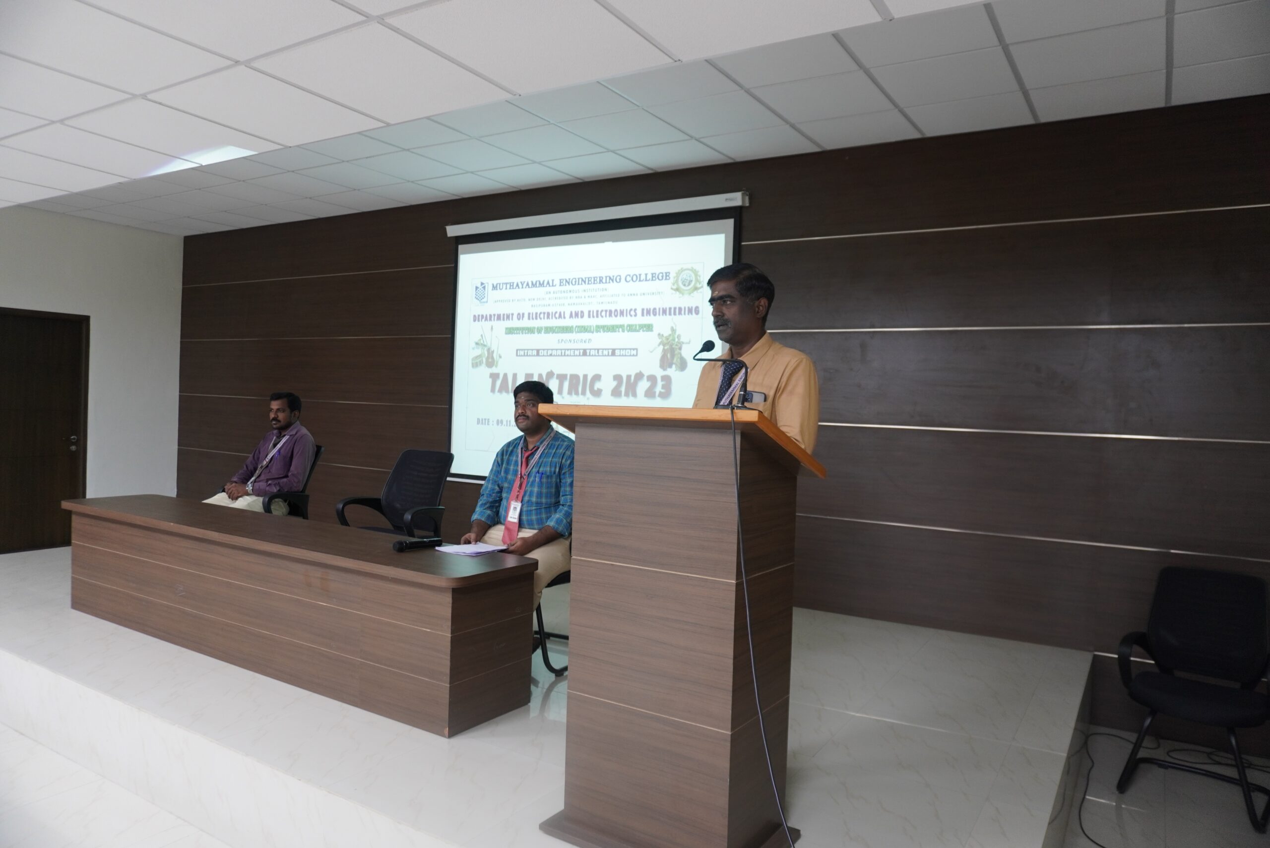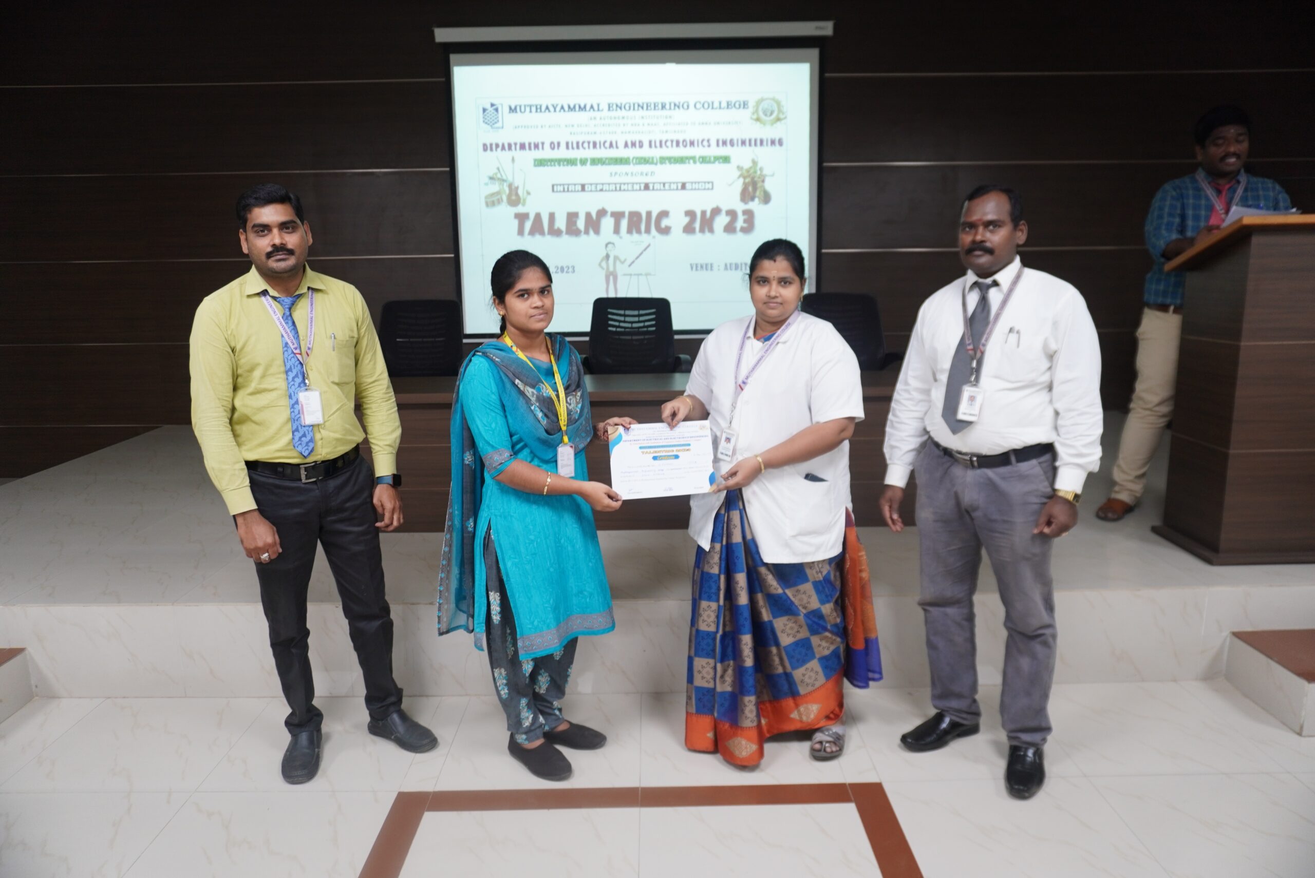 The Intra Department Talent Show was organized by the Department of Electrical and Electronics Engineering at Muthayammal Engineering College, Rasipuram on 09.11.2023. Dr. S. SARAVANAN, the Head of the Electrical and Electronics Engineering Department, warmly welcomed the attendees. The talent show featured a range of activities including an Idea contest, Paper presentation, Technical quiz, and other extracurricular activities.