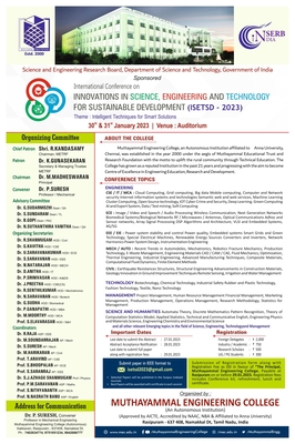 Muthayammal Engineering College (Autonomous), Organized DST-SERB Sponsored International Conference on “Innovations in Science, Engineering and Technology for Sustainable Development (ISETSD-2023)” Theme: Intelligent Techniques for Smart Solutions on 30th & 31st January 2023.