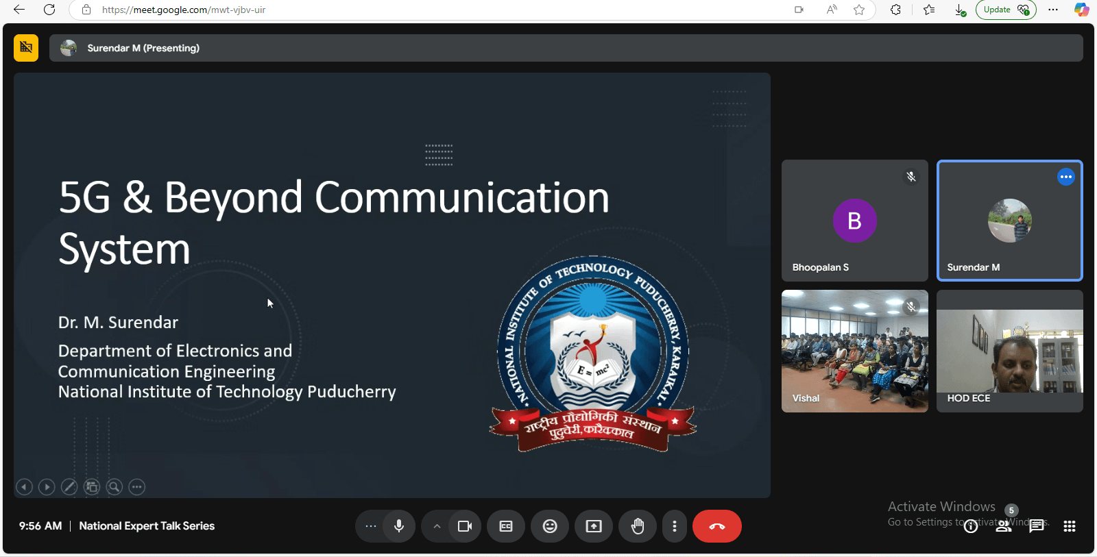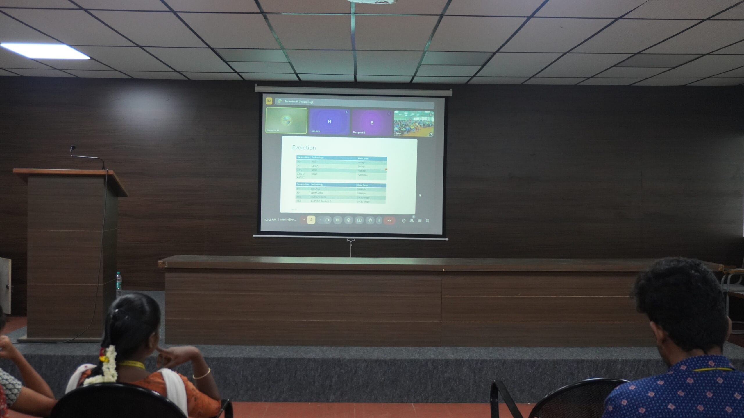 Dr. M. Surendar, Assistant Professor, Department of ECE, NIT Puducherry, delivered a lecture on “5G and Beyond Communication System” on April 8, 2025, at Muthayammal Engineering College as part of the National Expert Talk Series. He discussed the evolution of mobile networks, highlighting key metrics such as latency, throughput, cell density, spectrum availability, and efficiency. He also explained the three major 5G application categories: eMBB, mMTC, and URLLC.
