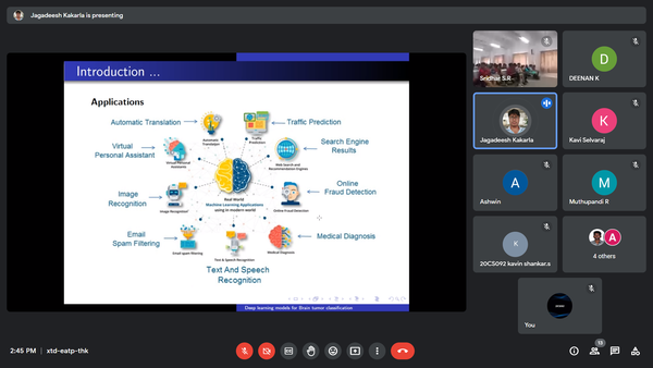 National Experts Techtalk Series (NETS) on Modernization: Medical Image Processing was Organized by the Department of Computer Science and Engineering on 06-02-2023. The Resource Person of the event was Dr.Jagadeesh Kakarla, Assistant Professor, Department of CSE, IIITDM Kancheepuram. He delivered about Data Visualization, Data Summarization, Data Set Description and Applications of Machine Learning and the students are actively participated in the NETS, had a good query session with the Resource Person.
