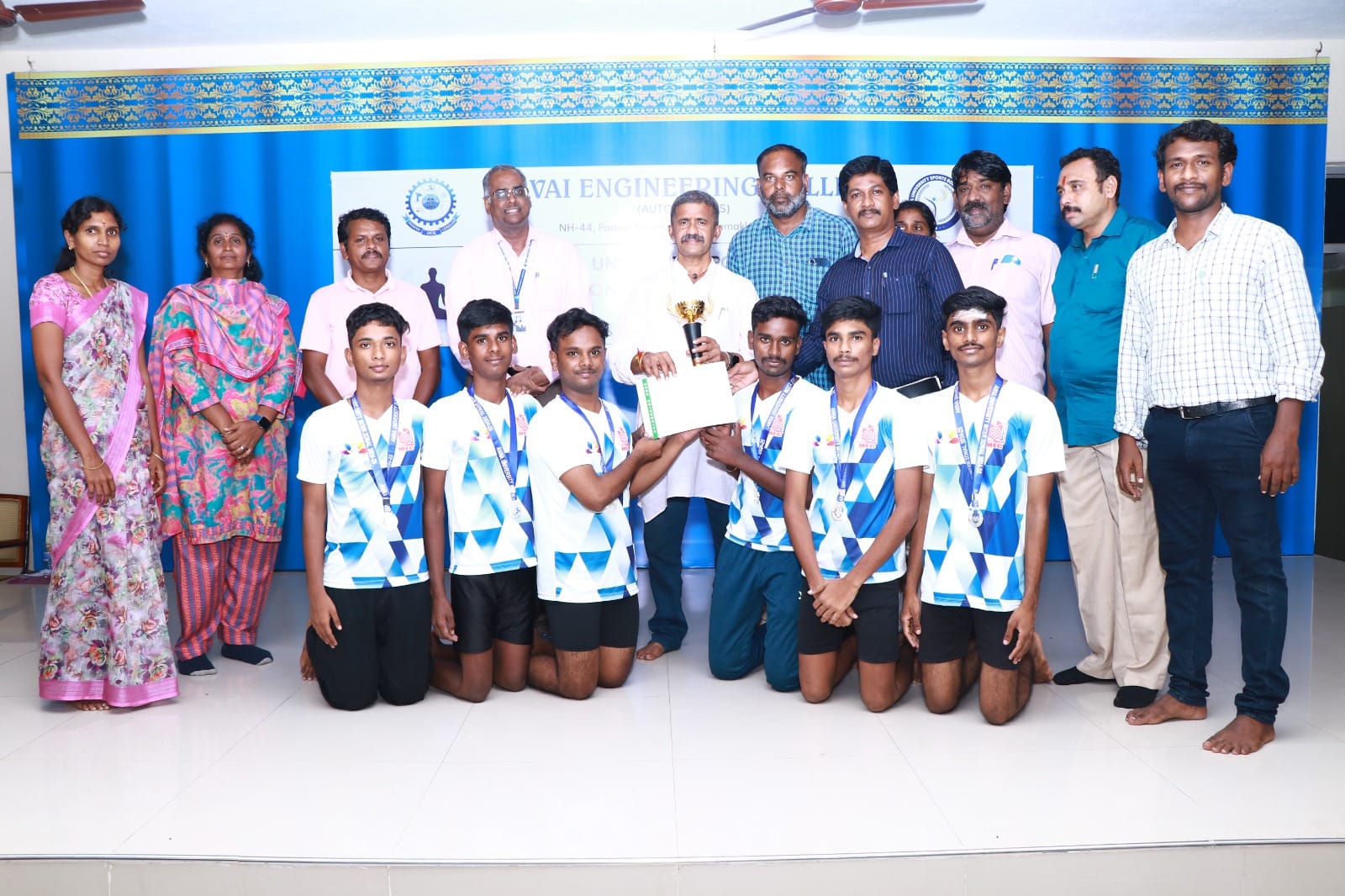 The State-level Inter Zonal Yoga Tournament for Men, hosted by Anna University, was held at Paavai Engineering College in Pachal, Namakkal. Our college’s men’s team achieved a commendable second place. Awards were presented to the following students by Dr. N. Senthil Kumar, Chairman, and Dr. S. Balakumaran, Secretary of the Anna University Sports Board, Chennai: S. Keerthivasan IV/CSE, S. V. Mouleeswar III/AI&DS, M. Reegan II/IT, S. Sesha II/IT, A. Deepak Kumar I/CSBS, and M. Madesh I/VLSI.