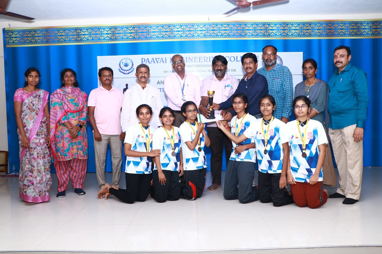 The Inter Zonal (State-level) Yoga Tournament for Women, hosted by Anna University, was held at Paavai Engineering College in Pachal, Namakkal. Our college’s men’s team achieved a commendable third place. Awards were presented to P. Pooja (II/CSBS), S. Keerthana (II/CSE), V. Jananandhini (II/CSE), V. Jothipriya (II/CSE), P. Elakkiya (II/VLSI), and S. Pradeepa (I/CSE) by Dr. N. Senthil Kumar, Chairman, and Dr. S. Balakumaran, Secretary of the Anna University Sports Board, Chennai.
