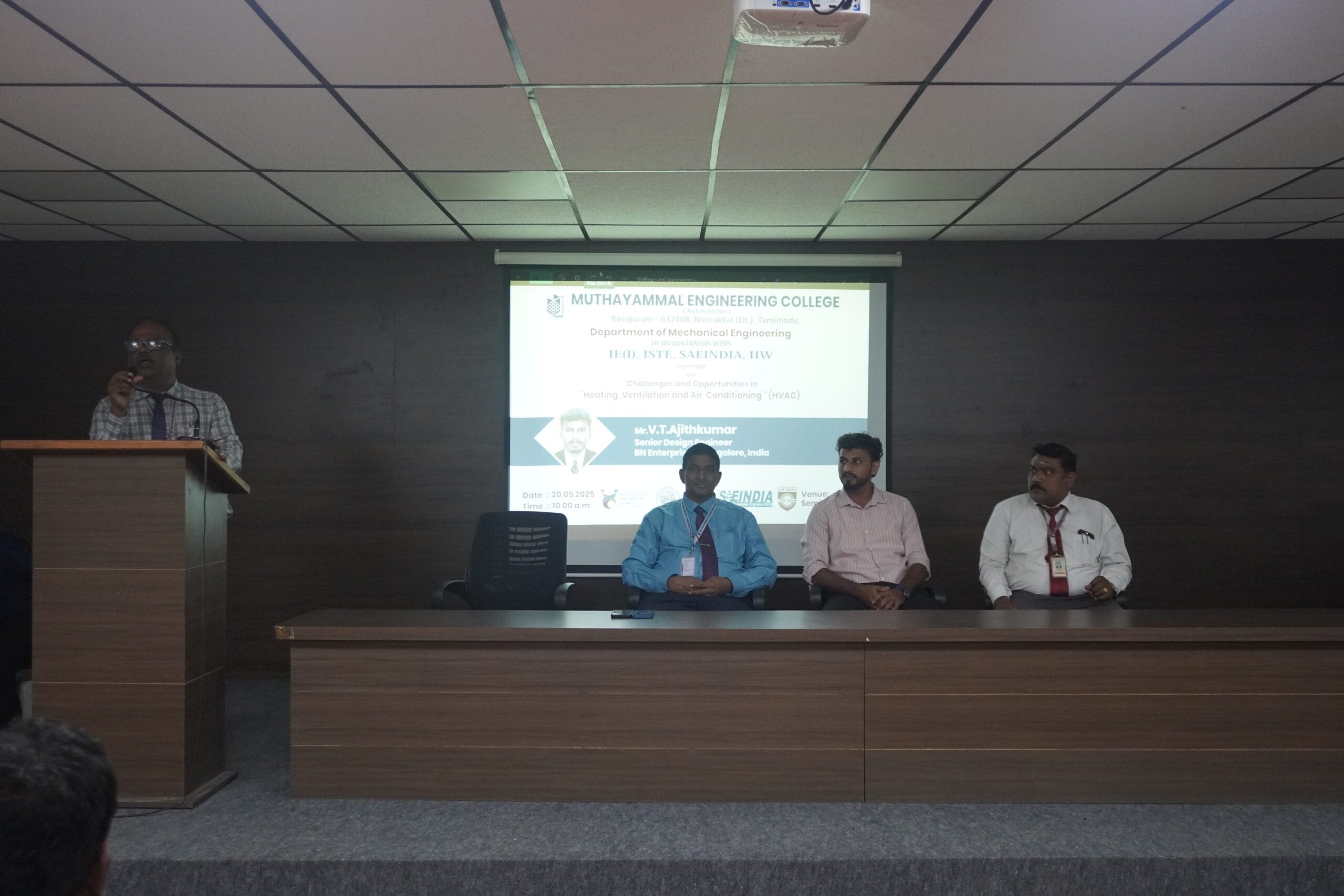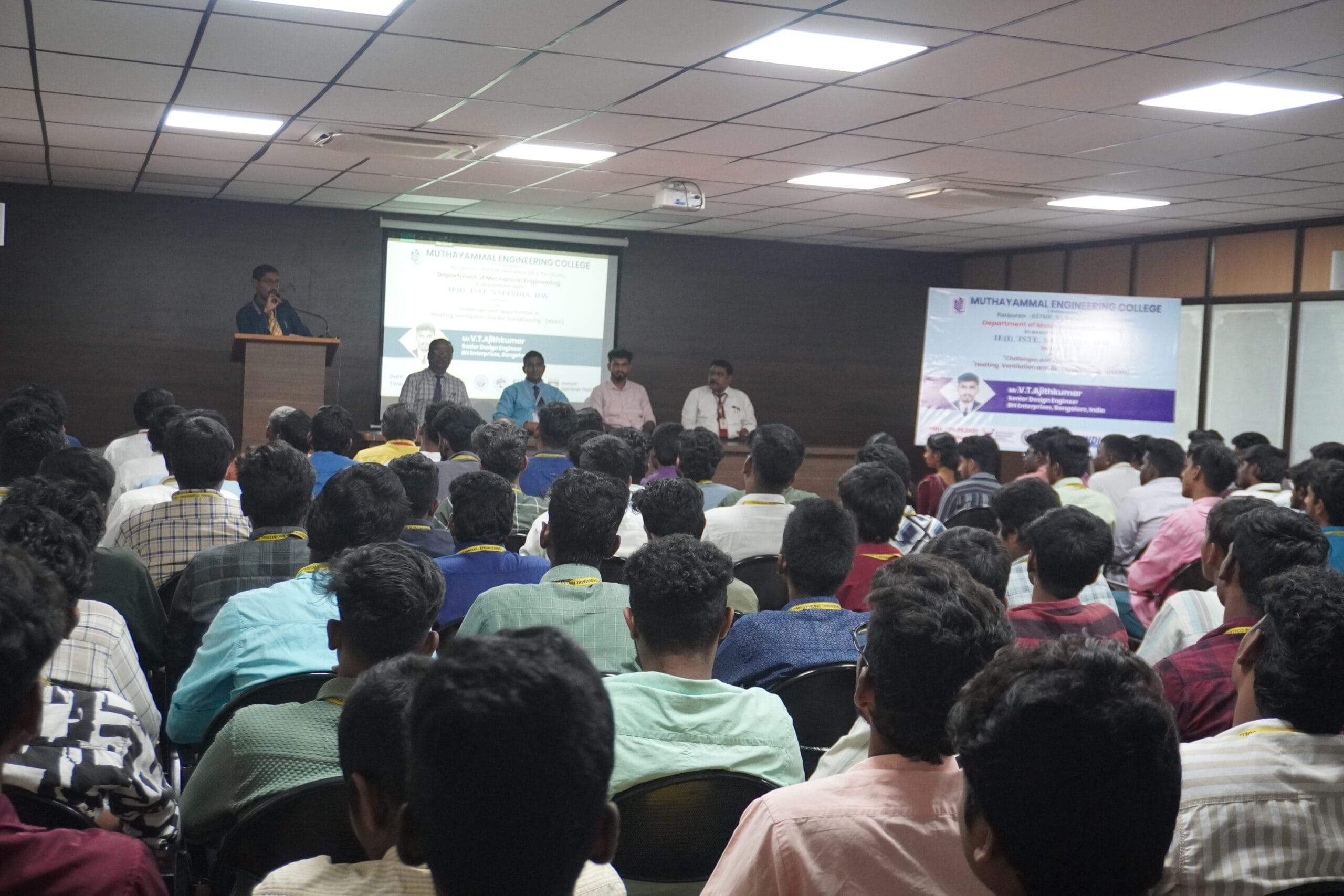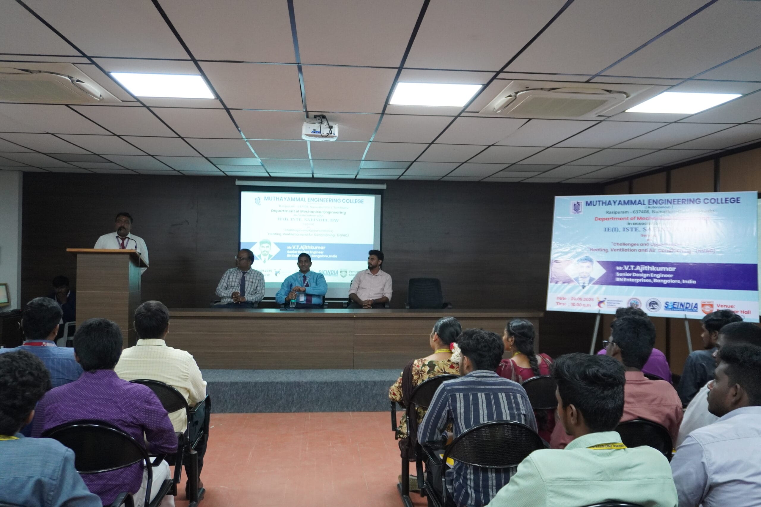 The Department of Mechanical Engineering hosted a seminar focused on the challenges and opportunities within Heating, Ventilation and Air Conditioning (HVAC). The speaker for the event was Mr. V.T. Ajithkumar, a Senior Design Engineer at BN Enterprises located in Bengaluru. He discussed the fundamental principles of HVAC and imparted his knowledge in this vital sector. He underscored the importance of acquiring knowledge in HVAC, pointing out that it represents a crucial domain where graduates of Mechanical Engineering can discover a wealth of opportunities.