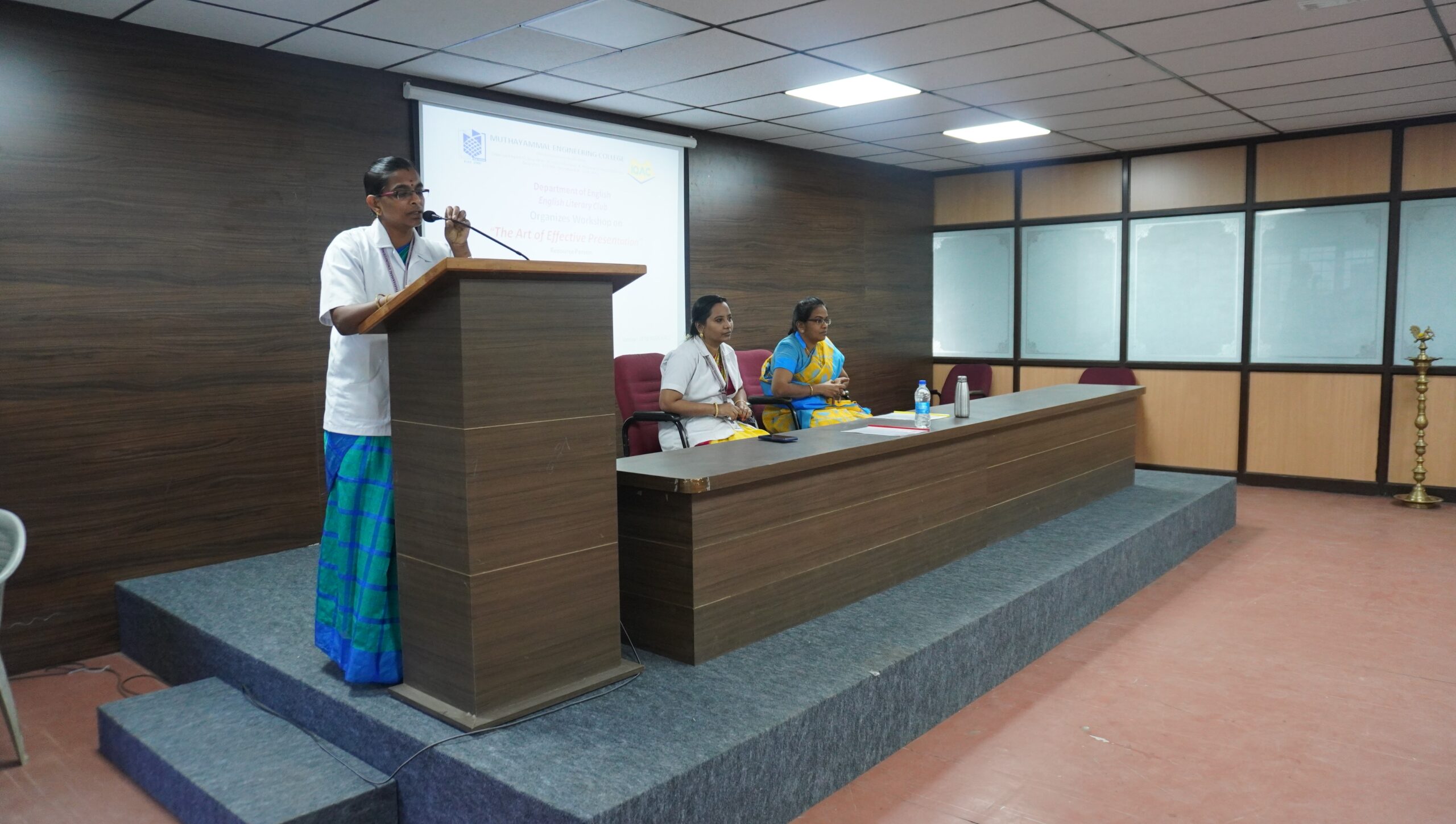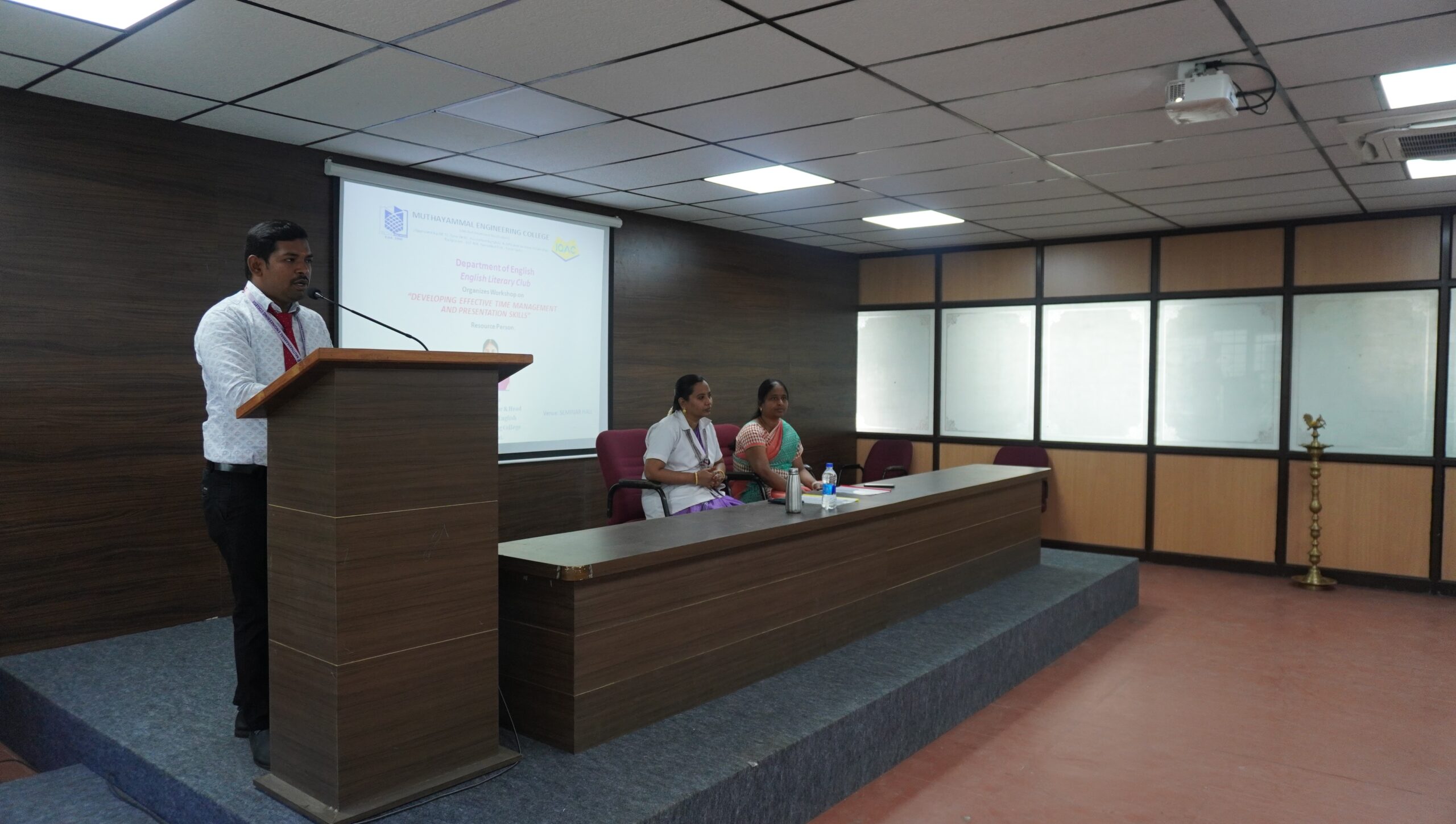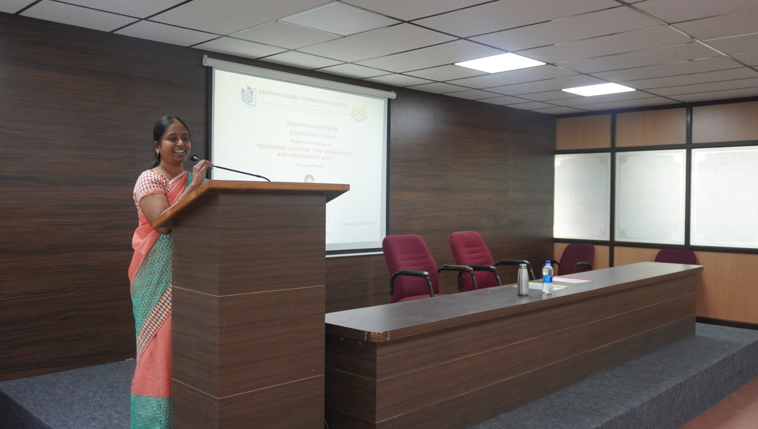 Muthayammal Engineering College (Autonomous), organized a two-day workshop titled “Enhancing Time Management and Presentation Skills” for the first-year B.E. and B.Tech students. The workshop featured presentations by Dr. J. Rajini, Associate Professor & HoD of the Department of English at Kongu Engineering College, Perundurai, on the topic of “Effective Time Management,” and Dr. R. D. Gomathi, Assistant Professor of the Department of English at Kongu Engineering College, Perundurai, on the topic of “Mastering Effective Presentation Skills.” The event concluded on a positive note, with active participation and enthusiasm from both faculty members and students.