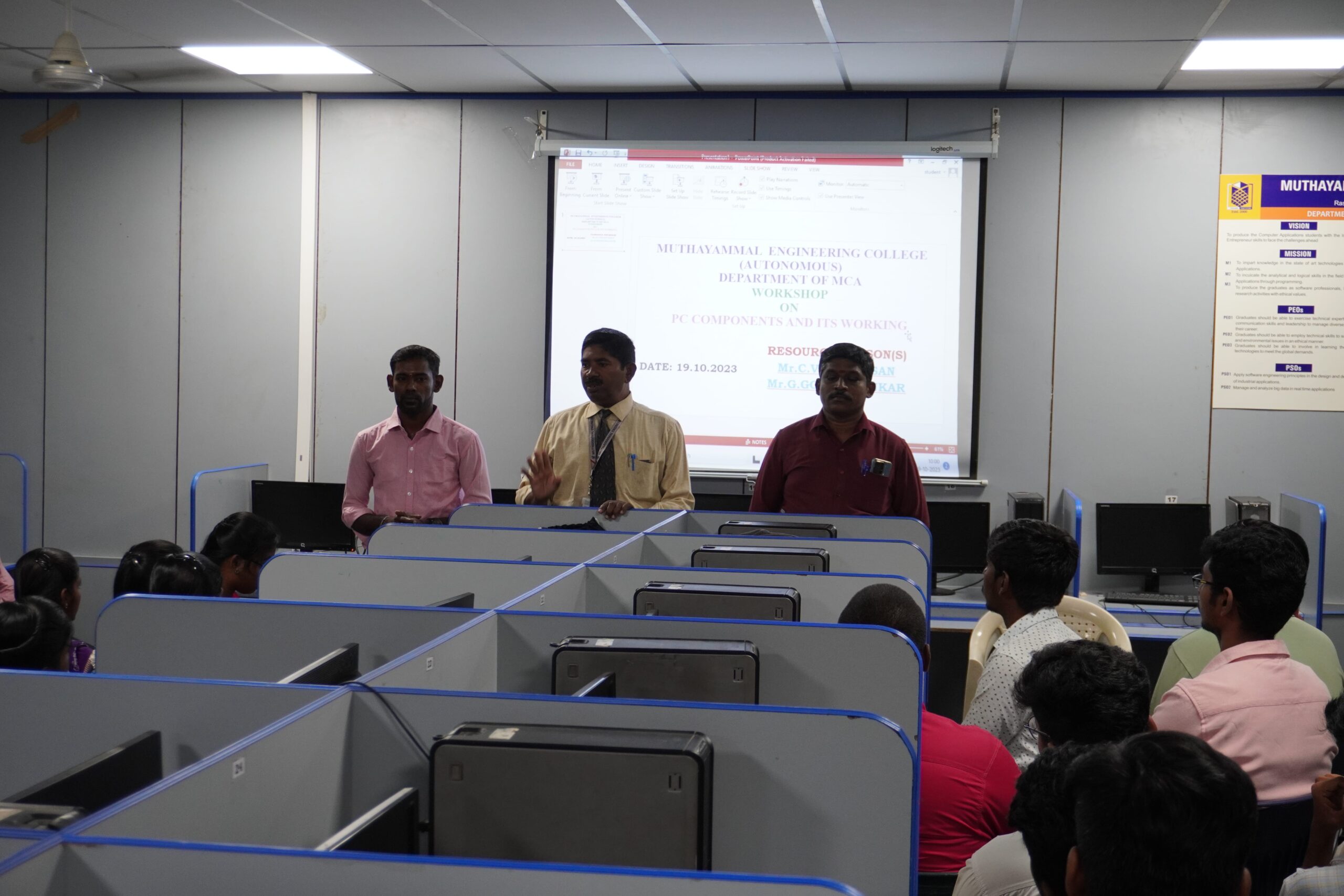 Workshop on PC COMPONENTS AND ITS WORKING Was Conducted by the Department of Master of Computer on 19/10/2023. The Resource Persons of the event were Mr.C.Venkatesan and Mr.Gowrisankar Gunasekaran, Dazz IT Wing Under Dazz Exports, Salem. They delivered about what is mean by Computer, Parts of Computer, PC Architecture, Processor Development, Secondary storage device, Virus and the students are actively participated in the Workshop.