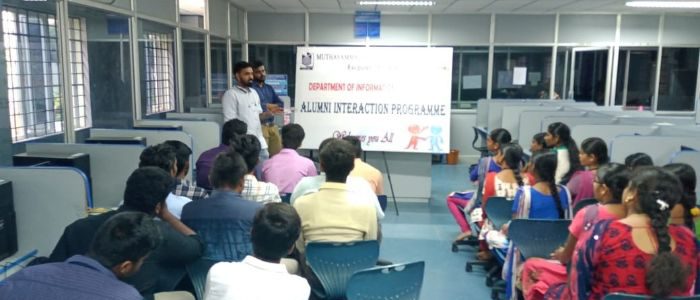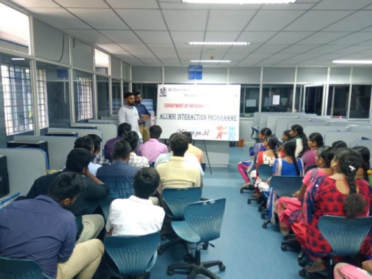 Alumni Interaction Programme on “Career Guidance and Full Stack Development” organized by the Department of Information Technology on 13.07.2019 at 11.00 am in Networking Lab. Professor E.Punarselvam, HoD/ IT welcomed the alumni Mr.K.Aravinth, Senior Software Engineer, Photon Interactive Pvt. Limited, Chennai and Mr.P.Gokulraj, Senior Project Engineer, Wipro Limited, Chennai. They gave a brief lecture about the career opportunities and the challenges faced by fresher in the industry and how to overcome it.