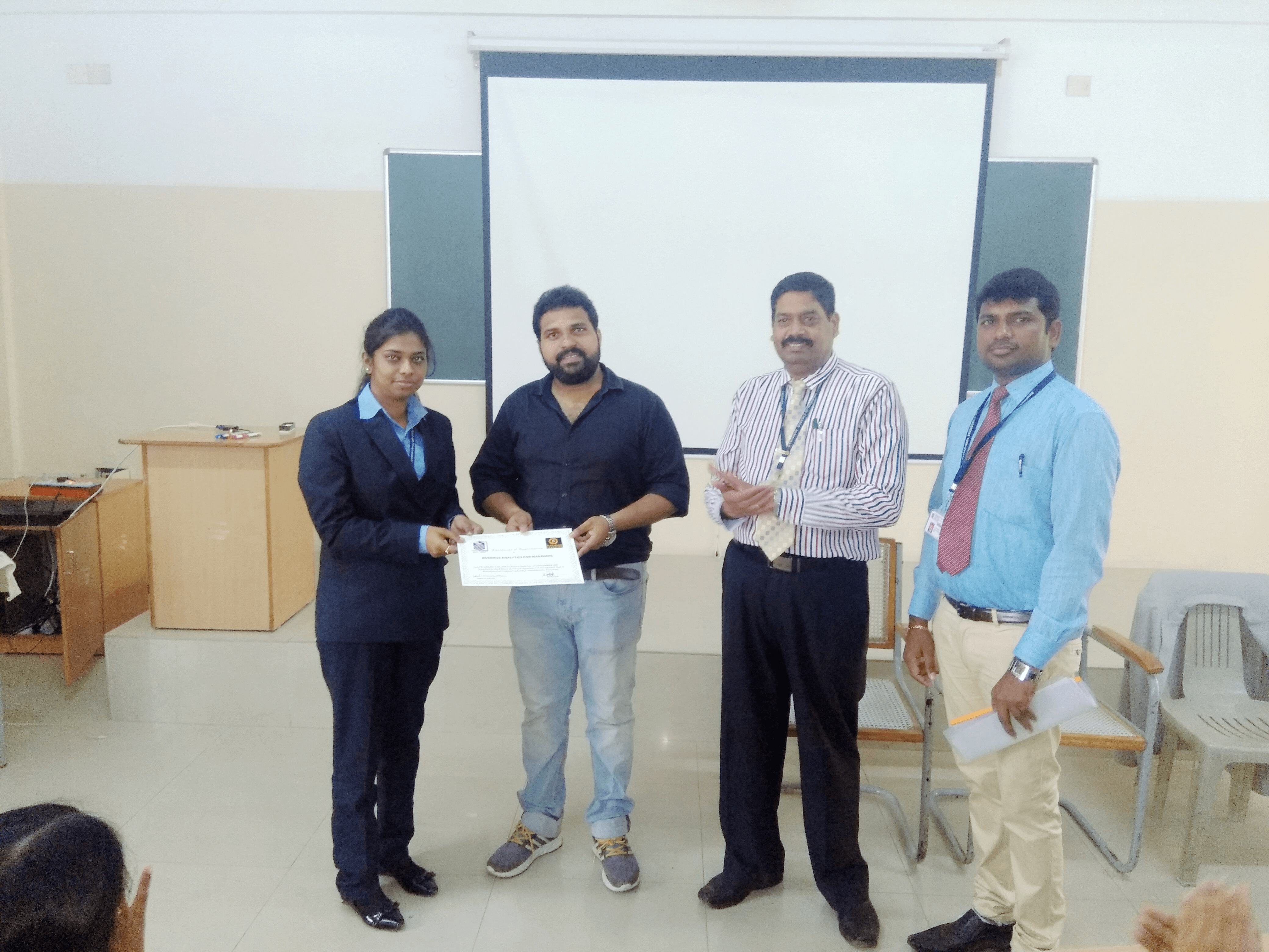 Department of Management Studies, Muthayammal Engineering College Rasipuram organised a certificate course on “Analytics for Business Managers” on 13th December, 2017 in Seminar Hall-II at the College Premises. The Chief Guest Shri. Karthik Veer, Chief Learner, Black Board Learning Coimbatore has highlighted the Marketing Opportunities in market and risk taken by the business man to become the best entrepreneurs in the society. He explained the importance of the certification course and job opportunity when the students learnt the new concepts. He also insisted the value of certification course required to succeed in their carreer. He has explained the concepts by –practical manner by using the lab and clearly students also learnt the concepts. The students understood the importance of the course and fully focused the certification programs. After finishing the course the students received the certificates.