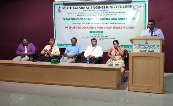 Three days National Level DST-SERB Sponsored Seminar on DEEP SENSE LEARNING FOR CROP HEALTH CARE held on 07-11-2019 to 09-11-2019. Dr.P.S.Shanmugam, Scientist and Programme Coordinator, Krishi Vigyan Kendra, addressed about the Importance of Crop Health Care. Dr. N.Sriram, Programme Coordinator, KVK, Salem gave the introduction about the Mobile based Agro advisory system application and its usage. Dr.P.Srinivasan, Prof/CSE and Mr.S.R.Sridhar AP/CSE were Organized the Seminar.