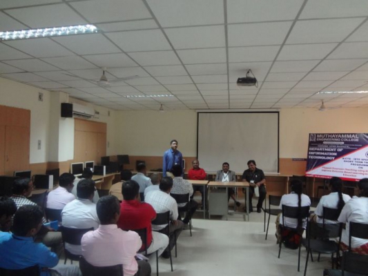 Indian Society for Technical Education(ISTE) Sponsored Short Term Training Programme (STTP) organized by the Department of Information Technology from 03.02.2020 to 09.02.2020 entitled “Flipped Classroom Teaching using ICT Tools Outcome Based Learning in Technical Education”. The Chief Guest Dr. V. Jayaprakasan, Professor, Electronics and Communication Engineering, Srinidhi Engineering College, inaugurated the programme and given a keynote address on Outcome based education and how to evaluate the results with modern tools and techniques. The Principal, Eminent Professors from various departments of Muthayammal Engineering College, continued the sessions on the following days giving in-depth knowledge on the above topic. The programme ended with certificate distribution and feedback session.
