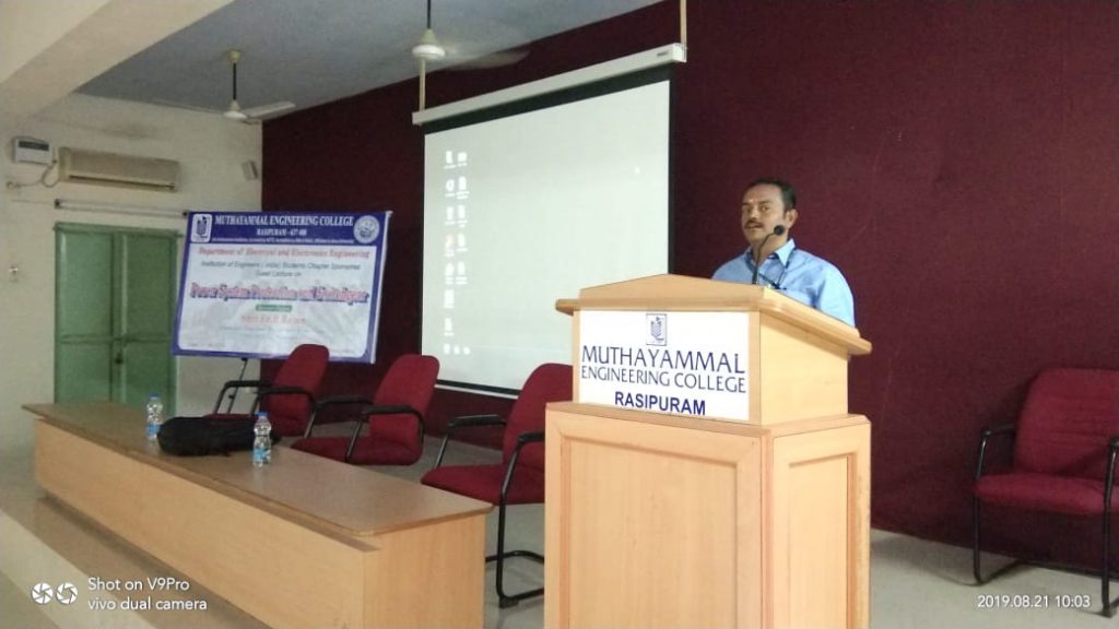 The Department of Electrical and Electronics Engineering Organized a Guest Lecture on Power System Protection and Switchgear on 21.08.2019. Resource Person Shri Er.R.Rajan Assistant Engineer, Meter and Relay Test, TANGEDCO, Namakkal provided an interactive talk about Power System Protection and Switchgear concepts.