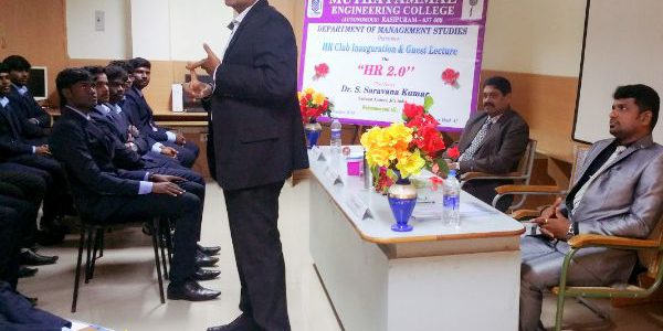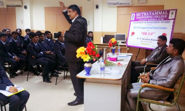 Muthayammal Engineering College (Autonomous) Rasipuram, Department of Management Studies has organized the HR Club Inauguration on 22.12.2018. The Chief Guest Dr.S.Saravanakumar, National Trainer, JCI India has highlighted the prime qualities and role of an HR Manager in an modern organisation in global scenario and also sir has explained about various opportunities available in HR department for the students to become a manager. Sir has conducted the activities like tourist management, time management through this event, sir has explained the strategies that how to become a best leader and how to lead the team like that. Students are very much involved in the activities and learnt the concepts.