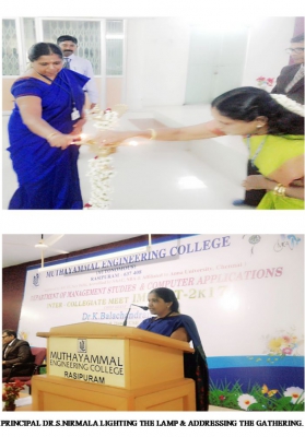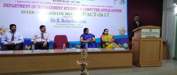 Department of Management Studies, Muthayammal Engineering College Rasipuram organized a “IMPACT 2k17 ” on 08.2.2017 in Seminar Hall-I at the College Premises. The Chief Guest of the function Dr.K.Balachandran, Professor and Head, Department of CSE, Christ University, Bengaluru highlighted failures are the stepping stones for success and also encouraged the students to utilise the available opportunities to the maximum and bring out their hidden skills in the competitions without any inhibitions.