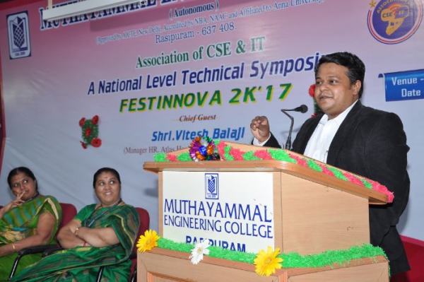 TECHNICAL SYMPOSIUM “TECH FIESTA 2017” was organized by the Department of Information Technology on 25.09.2017 at 09.30 am in Seminar Hall II. Symposium activities were inaugurated with the prayer song and by lighting the kuthuvilakku. Mr.A.S.Prabaharan, Head of the Department welcomed the gathering and the Chief Guest Mr.Vitesh Balaji, Manager HR, Atlas Health Care, Chennai. Honorable Secretary, Dr.K.Gunasekaran delivered the presidential address. Our beloved Principal, Dr.S.Nirmala delivered the principal address and honoured the chief guest with the bouquet and a memento. The chief guest, given a lecture about the importance of professional education, the expectations of companies from engineering students and the steps to improve the skill sets to compete in the IT industry. He thanked the college, department, staff members and students for their effort in making the event a great success. Various events were conducted and prizes were given to the participants.