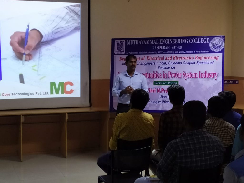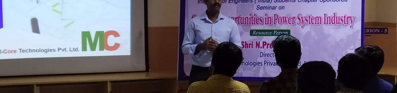 The Department of Electrical and Electronics Engineering Organized a Seminar on Carrier Opportunities in Power System Industry on 05.09.2019. Resource Person Shri N.Premkumar, Director, M-Core Technologies Pvt Ltd, Bangalore provided an interactive talk about the placement opportunities in Power System Industry.