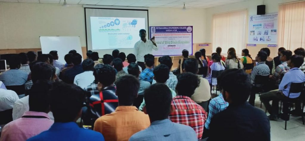 The Department of Electrical and Electronics Engineering Organized a Seminar on Control of Wind Driven Generators on 27.08.2019. Resource Person Dr.S.Senthilkumar Associate Professor, Department of EEE, NIT, Tiruchy provided an interactive talk about the Control of Wind Driven Generators.