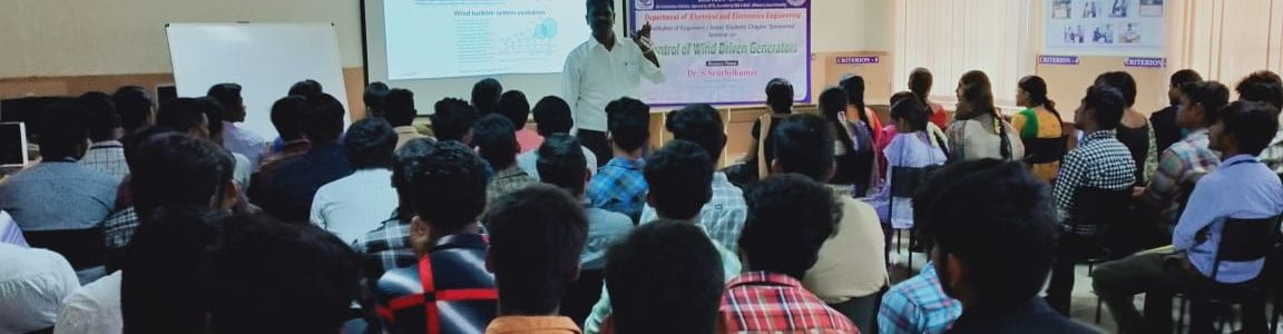 The Department of Electrical and Electronics Engineering Organized a Seminar on Control of Wind Driven Generators on 27.08.2019. Resource Person Dr.S.Senthilkumar Associate Professor, Department of EEE, NIT, Tiruchy provided an interactive talk about the Control of Wind Driven Generators.
