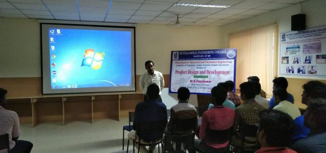 The Department of Electrical and Electronics Engineering Organized a Seminar on Product Design and Development on 20.09.2019. Resource Person Dr.K.Vijayakumar, Assistant Professor, Department of ECE, IIITDM, Kanchipuram provided an interactive talk about product design and development.
