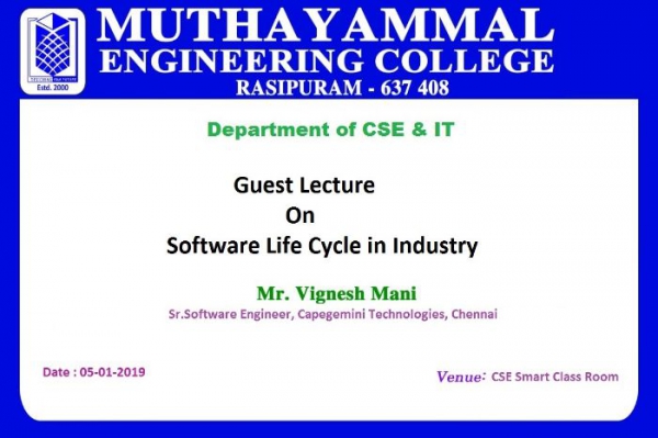 Guest Lecture on “Software Life Cycle in Industry” organized by the Department Of Information Technology on 05.01.2019 at 09.30 am in IT Smart Class Room. Mr.Vignesh Mani, Software Engineer, Capgemini Technology, Chennai, the Chief Guest for the programme. Students enjoyed the lecture given by the Resource Person on various approaches for developing Software. Mr.E.Punarselvam, honoured the chief guest with special memento.