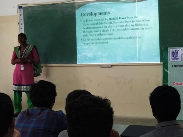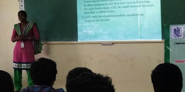 Ms. K. Tharani (16EC122), IV Year student from Electronics and Communication Engineering department gave presentation on Li-Fi Technology to IV Year ECE students on 25th February 2020 morning session in ECE Smart classroom. This presentation was co-ordinated by Mr. C. Sivakumar, Associate Professor, ECE department and had a Total participation of 25 students from ECE department. The presented content includes how Li-Fi Technology is emerged in worldwide and their applications. This presentation impressed most of our students.