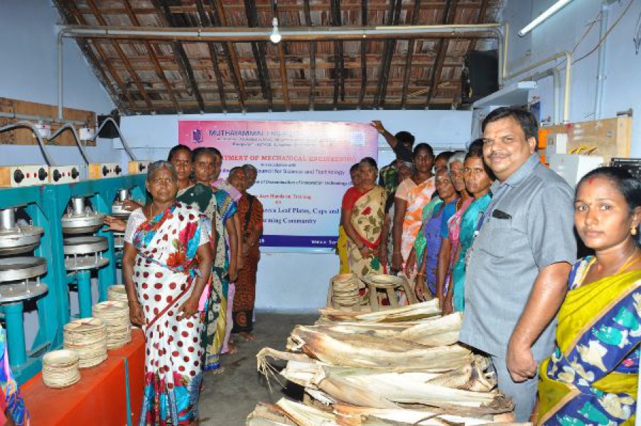 Department of Mechanical Engineering organized three days hands on training on Traditional Making of Areca Leaf Plates, Cups and Spoons to the Farming Community from 16.07.2019 to 18.07.2019. Dr.P.Suresh, Professor & COE. Brief about training. Dr.M.Matheshwaran, Principal, MEC focused on the necessity of Traditional Making of Areca Leaf Plates, Cups and Spoons. The Traditional Making of Areca Leaf products are brings the right solution for the replacement of plastic usage. Therefore the farmers are needed to come forward for making these kinds of natural products. And more than 50 formers were participated and benefitted through this training.